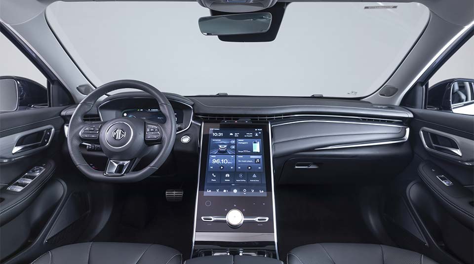 Interior espacioso y cómodo clásico de MG, ahora con pantalla touch de 19,4″ con Apple CarPlay® y Android Auto®, panel digital de 12,3″, cargador inalámbrico y sunroof panorámico, sello de MG.